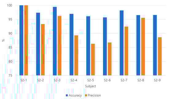 The type I error (false positives) was 13.4% and the type II error (false negatives) was 1.3%, which means that the error rate was different depending on whether the original data were positive or negative. That is, the error of erroneously predicting that there was an input command through eye movement in the case of no eye movement was 1.3%, and the rate of misrecognizing a specific angle of the eyeball through eye movement as another angle was 13.4%. This tendency mainly appeared when the precision of the subject was relatively low, as in subjects S2-4, S2-5, S2-6, and S2-9 of Figure 16. As a result of reviewing the recorded video of their eyes, unlike the eye movements seen during the individual tuning process, they showed a significantly slower eye movement in the process of searching for the alphabet position or checking the next input character for typing with the keyboard.