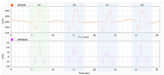 Figure 6a shows the DEFEOG signals for six subjects, and the shape of the MFDEOG signal passing through the filter is shown in Figure 6b. As shown in this figure, when the eyeballs moved to gaze at a new position, the EOG signals of all subjects similarly rapidly changed. However, signal drift occurred even while gazing at the same point, and the signal values tended to be changed. In addition, the shape of the signals was slightly different due to the influence of the subject’s eye movement characteristics or measurement noise. As shown in Figure 6b, most of the signal differences disappeared at the MFDEOG signal passing through the moving average filter. However, there were cases where the peak value of the signal was still different for each subject.