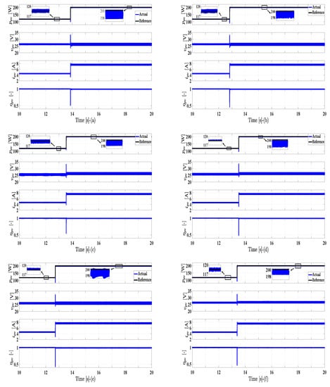- Intelligent MPPT techniques: In this branch, artificial neural network (ANN) and fuzzy logic controller (FLC) are employed []. However, these techniques require a lot of training and tuning efforts []. Recently, model predictive control (MPC) is gaining attention, and it can be classified within this group of MPPT. The MPPT-based MPC depends on the discrete-time model of the PV system, where the switching action is obtained using a predefined cost function []. The cost function determines the optimal switching state according to the difference between the reference and the predicted control parameter. Clearly, the MPC technique needs high computation power due to the prediction stage []. Furthermore, sliding mode control is also discussed in the literature, which presents numerous advantages such as precise tracking behavior and robustness to parameter variations [,]. However, the chattering problem is the main drawback of this control algorithm [].