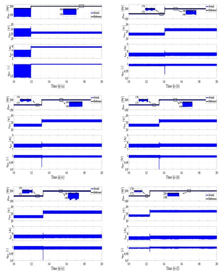 Figure 6 shows the performance of the MPPT methods at dynamic variations of radiation. At the first glance, the response of all methods is very similar. Therefore, a zoomed part from this figure is further investigated in Figure 7 to show the dynamics of power, voltage, and current.