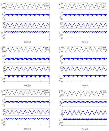 In the last case, a dynamic profile for the radiation is used to evaluate the efficiencies of the model-based techniques. The ramp profile is recommended by the European efficiency test (EN50530) [] to assess the performance of the PV system. Therefore, a similar profile, which is the triangular waveform is used to emulate the dynamic change of the radiation. This is a built-in function in the utilized HIL box, which simplifies the implementation of the former test.