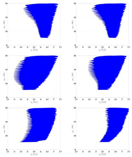 Moreover, to understand the differences among the various model-based schemes, the power-voltage curves for all studied methods are examined in Figure 8. The significance of these curves is to highlight the variation band of the voltage versus power. If this band is narrow, this means that the change of voltage is restricted to the maximum power region. Furthermore, if the former band is wide, this indicates that there is a deviation from the maximum power location. For the constant voltage method, temperature method, and voltage estimation technique (V2), the power-voltage behavior is very similar, where the band of voltage variation is approximately 1 V at low-power values, and 2 V in case of high-power levels. The voltage-based estimation method (V1) has the widest voltage range in comparison with other model-based schemes, where, at some operating points, the band is 3 V. The current-based procedure and the curve fitting method have the lowest margin of voltage variation among all studied methods.