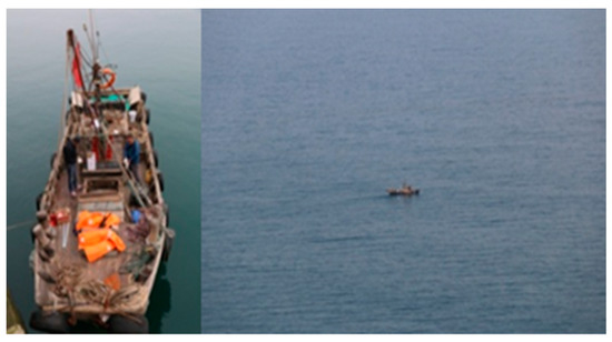 The cooperative target for RCS measurement is a wooden fishing boat 12.5 m long and 3.3 m wide. Its average speed is about 3 m per second. The fishing boat and its real state on the sea surface are shown in Figure 1. There are two main purposes of our experiment: one is to obtain target RCS data at different aspect angles, and the other is to obtain target RCS data under different wave conditions. For the shore-based radar, which relies on the movement of the fishing boat itself to get the target echoes at different viewing angles, a reasonable experimental plan was needed to guide the target motion.