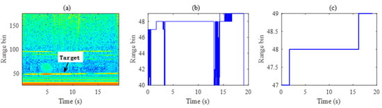 Process of target positioning based on radar echoes. (a) Distance-time amplitude map of radar echoes; (b) target range bin, with maximum radar echo intensity around the target; (c) modified target range bin by two-stage median filter.