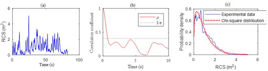 The experimental datasets labeled #001~#008 are measured at an aspect angle from 0° to 315° in intervals of 45°, and their correlation times and the parameter k are listed in Table 3. The series from data #001 is plotted in Figure 4a; its temporal correlation coefficient and probability distribution are depicted in Figure 4b,c, respectively, for example. From the perspective of temporal correlation, the correlation time of the measured target is in the order of seconds, which indicates that it is a slow fluctuating target. In addition, the parameter k for eight aspect angles is close to 1, which indicates that the cooperative target is more in line with the Swerling I model, and the RCS fluctuation characteristic is stable with the variation of aspect angle.