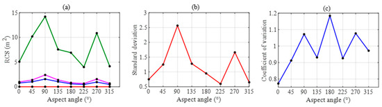 Furthermore, the six statistics in Equation (12) from eight aspect angles are estimated and depicted in Figure 5. The maximum value, mean value, median value, and minimum value of each aspect angle are marked in Figure 5a from top to bottom, successively; the standard deviation and the coefficient of variation are plotted in Figure 5b,c, respectively. We can see that the median value, mean value, maximum value, minimum value, and standard deviation have two peaks at aspect angles of 90° and 270°, and a similar variance trend with the aspect angle, and yet the coefficient of variation has three peaks at aspect angles of 90°, 180° and 270°. From Figure 5a, the maximum value of the target RCS occurs when the aspect angle is at 90° and the minimum value when the aspect angle is 225°, with their mean values having a difference of 1.75 m2. It is noted that the standard deviation in Figure 5b is positively associated with the RCS level, and the difference in the RCS level at different aspect angles renders it invalid as a statistic to represent the degree of dispersion of the RCS. Nonetheless, the coefficients of variation in Figure 5c are close to 1, except that the prow and stern are 0.77 and 1.18; this insensitivity to aspect angle demonstrates that it may be available for target classification.