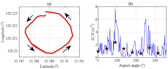 Besides, data #101 was recorded at an aspect angle of 0° to 360°, when the cooperative fishing boat made a circular motion around point B (Figure 2). The longitude and latitude of the target track are plotted in Figure 6a. The target’s average RCS over aspect angle “windows” 2° wide is depicted in Figure 6b. The mean value of the RCS in Figure 5a is also marked with red stars (as in Figure 6b) for comparison. Note that the target’s RCS is the largest when the radar beam illuminates the ship starboard directly and that they have the same variation trend with aspect angles using two measurement modes. Additionally, the mean value of the RCS at all aspect angles is 1.59 m2, and the mean value of the RCS from eight aspect angles is 1.22 m2. The consistency of these two measurement modes indicates the representativeness of these eight aspect angles and the validity of the experimental plan.