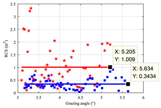 Due to the slow motion of the target, there are multiple pulses that can be obtained from each range bin. Then, the average RCS of multiple pulses in each range bin is utilized to eliminate the randomness of the observed value. Figure 7 depicts the average RCS from each range bin varying with the grazing angle. The blue squares are the measured values of data #201, and the blue line is their average value. The red stars are the measured values of data #202, and the red line is their average value. We can see that the average RCS for 0.48 m significant wave height is 0.67 m2 greater than that of the 0.28 m significant wave height. Table 4 charts their RCS fluctuation characteristics and statistics. From the perspective of the parameters in Table 4, we note that the correlation time, parameter k of chi-square distribution, and coefficient of variation between the two datasets are similar, but others are inversely proportional to wave height.