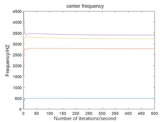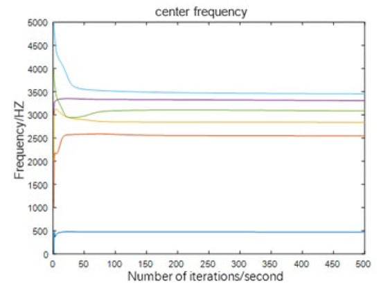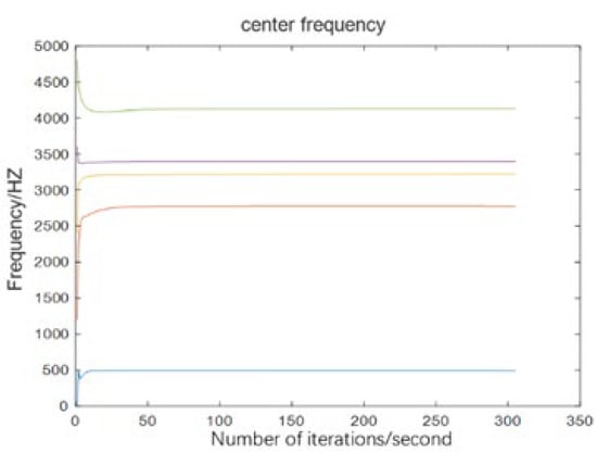 The abscissa in the figure represents the number of iterations, and the ordinate represents the center frequency. The four curves represent the central frequency convergence process of the four modal components, respectively. When K = 4, as shown in Figure 1, the four curves do not overlap, which proves that there is no mode mixing. There are occasional fluctuations in the previous iteration, and the convergence is fast. When the number of components K is 5, the relationship between the center frequency of the modal component and the iteration parameters is as shown in Figure 2. With the increase in the number of abscissa iterations, the center frequencies corresponding to the five modal components converge smoothly and fluctuate less, and there is no curve intersection. When the number of decomposition K = 6 is selected and the same vibration signal is decomposed, the central frequency convergence process of the modal component is as shown in Figure 3 and Figure 4. The abscissa in the figure represents the number of iterations, and the ordinate represents the center frequency. From the curves corresponding to the six modal components, it is obvious that the third, fourth, and fifth curves also correspond to the intersection of the third, fourth, and fifth order modal components, respectively. This proves that there is modal mixing between modal components, and the convergence speed is slow. In summary, in the VMD decomposition preprocessing of this kind of bearing vibration signal, the preset value of the modal component is 5, which is more effective for the signal decomposition effect and helpful for the next feature extraction.
