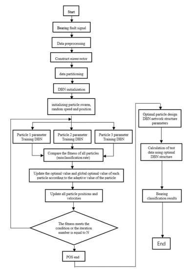 The particle swarm optimization algorithm is the same as many algorithms; that is, after the system initialization, it starts to iterate through a group of solutions, and constantly looks for the optimal solution in the iterative process. Particles (potential solutions) will follow the best particles in space to explore, so the number of iterations required to reach the best solution is relatively small. In the engineering application in the field of bearing diagnosis, particle swarm optimization can be easily employed because of its simple principle, strong universality, and strong anti-interference. Moreover, the algorithm supports group search and takes a short time. Combined with the above advantages, this paper selects the PSO optimization algorithm to improve the DBN model.