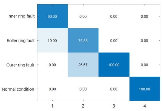 Here, the experimental results of the DBN model input by the composite multi-scale scattered entropy eigenvector obtained after the decomposition of the original signal are analyzed. As shown in Figure 9, the recognition rate of each fault type of rolling bearing can be seen. According to the different numbers marked in this paper, they represent different fault types. Number 1 corresponds to the inner ring fault signal, and the recognition rate is 90%. Number 3 represents the outer ring fault signal, and the recognition rate is 100%. Number 2 corresponds to the roller fault signal, and the recognition rate is 73.33%. Number 4 corresponds to the normal bearing signal, and the recognition rate is 100%. After calculation, the overall recognition accuracy reaches 90.33%.
