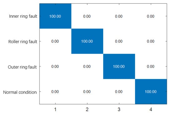 According to this data, Table 3 is established. From Table 3, we can clearly see the identification number of each fault type; among them, 30 groups of bearing with inner ring fault are correctly identified, 30 groups of roller fault are correctly identified, 30 groups of bearing with outer ring fault are correctly identified, and 30 groups of bearing under normal conditions are correctly identified.