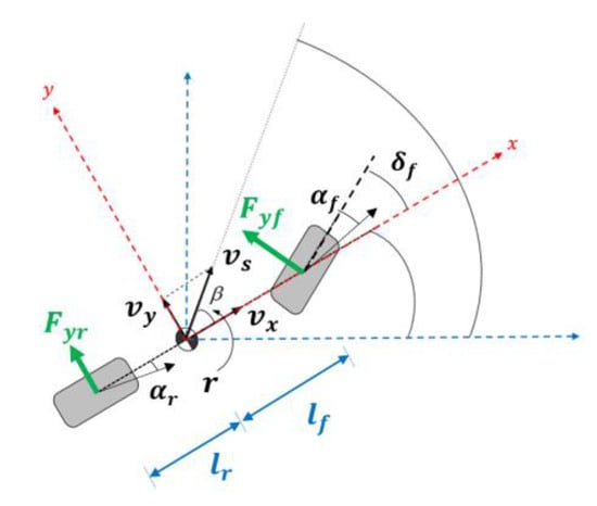 The vehicle bicycle model assumes that left and right wheels are lumped together into a single wheel [15]. In this paper, Figure 1 represents a vehicle bicycle model. Since it is assumed that the wheel is located on the center line, the concentrated tire lateral forces and are expressed in the front and rear tire coordinate systems, respectively. Additionally, this vehicle bicycle model assumes that the vehicle motion is restricted to the plane and that there is no vertical movement. In the car body coordinate system, the moment and lateral force balance equations are derived as: