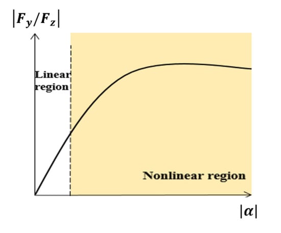 where is the height of CG, and the normalized cornering stiffness () is divided by the nominal parameter and the unknown . The nominal parameter is the slope in the linear domain of the normalized tire lateral force, as shown in Figure 2. However, it cannot be denied that fixed without adjustment in the non-linear region reduces the accuracy of the tire lateral force. [16]. When the non-linear region is reached, the slope decreases. The unknown variable can be expressed as a change in slope. In order to be robust to such road uncertainty, unknown variables and , i.e., changes in cornering stiffness, must be estimated.