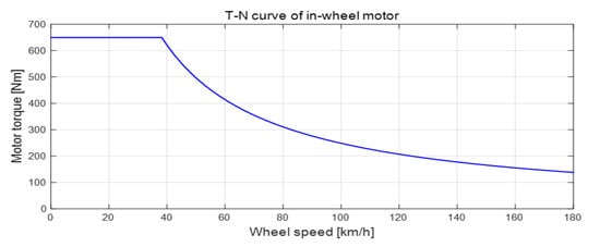 Figure 4 shows the T-N curve, representing the inverse relationship between the maximum available motor torque and the wheel speed () of wheel .