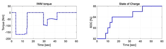 Additionally, as shown in Figure 5, the state of charge of the IWM battery can be charged with negative IWM torque during most regenerative braking [22,23]. To prevent overcharging of the IWM battery, it is recommended to strictly limit the maximum regenerative torque (negative limit value). Therefore, is asymmetrically smaller than in this IWM system. Finally, the maximum usable yaw moment was designed as: