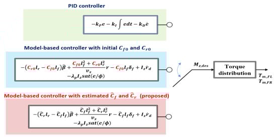 Substituting (9) into (10), the error dynamic equation is completed. Finally, the control input, the desired yaw moment , was derived as follows: