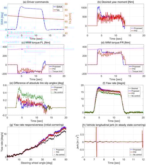 Simulation results of circle turn test (vs. PID controller). (a) Driver commands. (b) Desired yaw moment. IWM torques: (c) FL, and (d) FR. (e) Difference in absolute tire slip angles. (f) Yaw rate. (g) Yaw rate responsiveness (in initial cornering). (h) Vehicle longitudinal jerk (in steady state cornering).