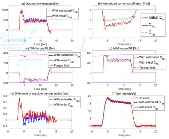 Simulation results of circle turn test (vs. model-based controller with initial ). (a) Desired yaw moment. (b) Normalized cornering stiffness. IWM torques: (c) FL, and (d) FR. (e) Difference of absolute tire slip angles. (f) Yaw rate.