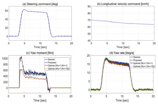 An optimal WLS assignment with produced a smaller IWM torque than the proposed WLS assignment with . This produced an actual yaw moment that was much smaller than the desired yaw moment (see Figure 9c). Additionally, the actual yaw rate in Figure 9d was much smaller than the desired yaw rate. An optimal torque allocation with weight of 100 was implemented to increase the actual yaw moment. However, this also produced a smaller actual yaw moment than the proposed WLS assignment with .