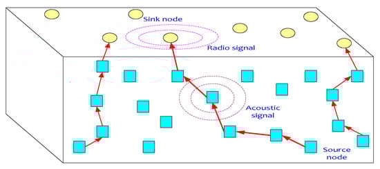 The high-paced emergence of communication technologies and associated applications has gained significant attention across academia and industry to enable efficient low cost, energy efficient and quality of service (QoS) communication support. In the last few decades, providing underwater communication has emerged as a vital research domain for both academicians as well as industries. Recently, underwater wireless sensor networks (UWSNs) [1,2] have been used exponentially in varied applications including environmental monitoring, gas deposit exploration, tsunami warning, assisted navigation, distributed tactical surveillance, mine reconnaissance, oceanographic data collection, oil spill monitoring, real-time warship monitoring, disaster prevention, etc. Although UWSN is stated to be closely related to the WSN, many research reports [3,4,5,6] have revealed that generic techniques developed for WSNs cannot be applied for UWSNs, due to the practical operating characteristics of the underwater channel [7]. The main issues allied with the underwater channel comprise high propagation latency caused by low propagation speed of acoustic signals (usually, 1500 m/s), strictly confined accessible resources [8], wave caused disturbance, noise presence, dynamic delays [9] and high error rate probability. The dynamic topological variations also make protocols vulnerable to suffering link loss and data drop across multipath and fading channel conditions [10]. This might cause significantly higher data retransmissions, increased latency, high energy exhaustion and cumulative QoS degradation. To alleviate such issues, enabling an efficient routing protocol while ensuring optimal data delivery, throughput and minimal energy exhaustion can be of paramount significance.