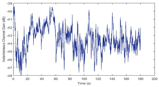 The gain model, as depicted in (58), refers to a fixed channel geometry characterizing the nominal attenuation at the distance . However, due to movement over time, scale varies accordingly. It is expected that maintains a log-distance relationship, given as (58):