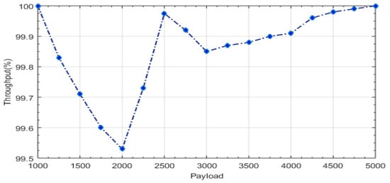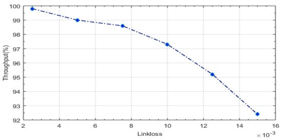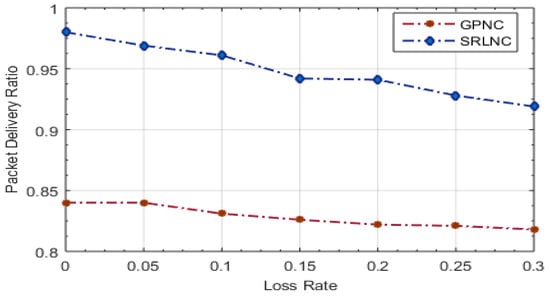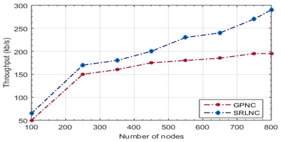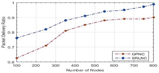 Upon assessing the effectiveness of the proposed SRLNC scheme for efficient data transmission and finding it optimal, it was applied for data transmission over UWSN. To examine the effectiveness of the proposed UWSN routing protocol, we considered [53,54] as a reference routing protocol. The overall algorithm including channel model and systematic RLNC based UWSN routing protocol has been developed using the MATLAB 2015a simulation platform. To perform the simulation, a total of 800 nodes were distributed across UWSN in 3D network environment (Figure 1). Here, the acoustic signal’s propagation speed was taken as 1500 m/s. Each sensor node has the radio range of 250 m, and the initial energy was 100 J per nodes. Further, the rate of consumption was 60 uJ/bit. A number of packets of 64 kB size were generated by the source node. Now, considering SRLNC implementation for UWSN simulation, the number of packet combinations per generation is fixed at 10, with Galois Field size 8. As presented in Figure 8, our proposed SRLNC based routing protocol outperforms GPNC based UWSN routing. However, the effect of link loss on the packet delivery ratio (PDR) can be easily observed. In Figure 8, the average PDR of the GPNC protocol is 82.8%, while our proposed SRLNC based routing exhibits 94.85% PDR. SRLNC exhibited 12.5% higher PDR than GPNC based UWSN routing. Figure 9 depicts the effect of the number of nodes on PDR. Results reveal that with an increase in the number of nodes, PDR increases gradually. GPNC has exhibited on average 81.9% of the PDR, while SRLNC ensures 90.28% PDR, which is almost 8.4% higher than GPNC. The similar result can be observed from Figure 10, where our proposed SRLNC scheme exhibits approximately 4.8% higher throughput than GPNC. In UWSN’s delay is one of the key factors required to be optimal [55].