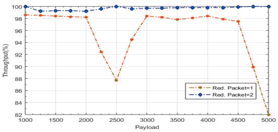 To enable an optimal computationally efficient routing scheme over UWSNs, enriching FEC is vital. Maintaining a minimum number of redundant packets to decode the data packets can be advantageous. It can reduce the computational overheads as well as unwanted bandwidth utilization. To estimate the minimum number of redundant packets per generation to have maximum data decoding at the receiver node, we tested SRLNC with one and two redundant packets per generation, where the proposed approach exhibited higher throughput with two redundant packets per generation. It signifies that with two redundant packets per generation, SRLNC can provide higher throughput and, hence, optimal performance towards efficient communication (Figure 7).
