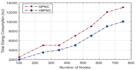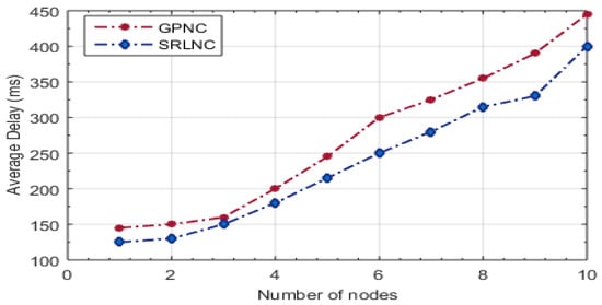 Figure 11 presents the results obtained for the effect of the number of nodes on the average delay. The proposed SRLNC based UWSN routing exhibits 12.53% lower delay than the GPNC protocol. This is because of increased throughput, reduced data drop and, no doubt, enhanced FEC mechanism. Observing the above discussed results and their significances where the proposed routing scheme provides higher data delivery rate, throughput and minimal delay, it can be understood that with such accomplished performance, the probability of retransmission should be minimal and so should the energy exhaustion. To confirm this, Figure 12 justifies that the proposed routing scheme results in lower energy consumption than the GPNC based routing protocol. Here, SRLNC consumes approximate 24.3% less energy than the GPNC based routing approach [56,57,58].
