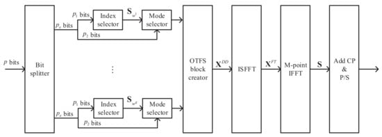 Index modulation in the frequency domain is usually performed with the aid of either the frequency carriers or OFDM subcarriers. OFDM with an index modulation (OFDM-IM) system improves the spectrum efficiency (SE) of the OFDM system and achieves better performance [,]. The OFDM-IM system activates only a subset of all avaliable subcarriers to carry M-ary data symbols and uses the subcarrier activation patterns as information-bearing units. In [], an OTFS with an index modulation (OTFS-IM) system was proposed. The OTFS-IM system transmits modulation bits by activating partial grid resources and transmits index information by using the location information of activated grid points. Although the OTFS-IM system achieves better BER performance, only some of the grid resources are activated, resulting in the waste of grid resources and a low SE of the system []. An OTFS with improved index modulation (OTFS-IIM) was proposed in []. Unlike the OTFS-IM system, each index information is transmitted twice in the OTFS-IIM system, which reduces the error rate of the index bits and further improves the BER performance. However, the problem of grid resource waste has not been solved. To solve this problem, an OTFS with dual-mode index modulation (OTFS-DM-IM) was proposed []. In the OTFS-DM-IM system, all grid resources are activated for transmitting modulation bits, achieving a better balance between transmission reliability and SE in the time-varying channel. Moreover, the theoretical BER upper bound was presented to give the benchmark of the OTFS-DM-IM system.