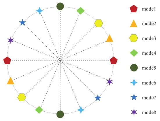 To achieve index modulation, the different constellation modes need to satisfy , where , . By rotating the constellation diagram of -ary phase shift keying (PSK) mn times, where the rotation angle is , the signal constellations of -ary PSK with different modes can be obtained []. Figure 3 shows the BPSK signal constellation diagram of eight different modes, which is obtained by rotating the original BPSK signal constellation eight times. Therefore, and can be calculated as and , where is the floor function.