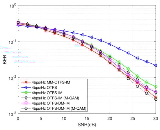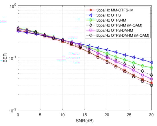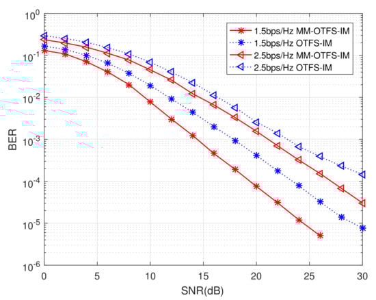 In Figure 5, we compare the BER performance of the proposed MM-OTFS-IM system with the OTFS-IM system under different SEs. It can be seen from Figure 5 that when the SE was 1.5 bps/Hz and 2.5 bps/Hz, the BER performance of the MM-OTFS-IM system was better than that of the OTFS-IM system. For example, when the SE was 2.5 bps/Hz, the MM-OTFS-IM system achieved a performance gain of 2 dB compared to the OTFS-IM system at the BER level of . When the SE was 1.5 bps/Hz, the MM-OTFS-IM system achieved a 5 dB gain over the OTFS-IM system at the BER level of . Under the same SE, the MM-OTFS-IM system used a lower order constellation to modulate the transmission symbols, which resulted in a larger Euclidean distance between the transmission symbols; thus, the BER performance of the proposed system was improved.