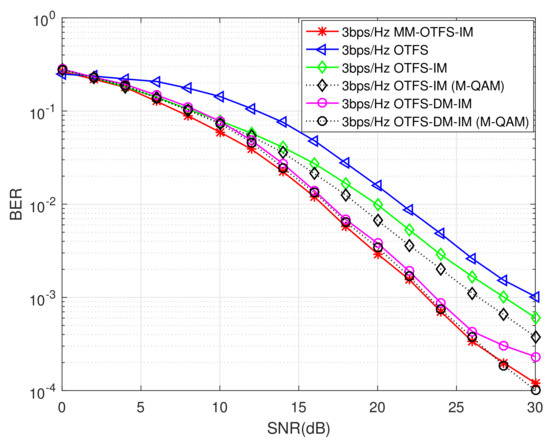 The BER performance comparisons between the MM-OTFS-IM, the OTFS, the OTFS-IM, and the OTFS-DM-IM system with SEs of 3, 4, and 5 bps/Hz are shown in Figure 6, Figure 7 and Figure 8, respectively. Both the OTFS-IM and the OTFS-DM-IM system used M-PSK and M-QAM modulation modes, and the OTFS and the MM-OTFS-IM system used M-PSK modulation. The MM-OTFS-IM system obtained the best BER performance compared with the traditional OTFS, OTFS-IM, and OTFS-DM-IM systems with the same spectral efficiency at a high SNR region when using M-PSK modulation and the OTFS-IM with M-QAM. Under the same spectral efficiency, the BER performance of the OTFS-DM-IM system was slightly better than that of the MM-OTFS-IM system when M-QAM modulation was used. This is because the noise produces strong interference on the transmitted signals at a low SNR region. Thus, the application of index modulation causes a high occurrence probability of index bits detection error during demodulation, resulting in the BER performance of OTFS-IM, OTFS-DM-IM, and MM-OTFS-IM systems being worse than that of the OTFS systems. Under the condition of a high SNR region, because all grid points in the MM-OTFS-IM system were activated, and a large number of index bits were transmitted implicitly through the combination of different modes of the constellation, the BER performance of the MM-OTFS-IM system was improved.
