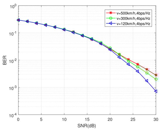 Figure 9 shows the effect of different UE speeds on the BER performance of the proposed MM-OTFS-IM systems. In the figure, the SE of the MM-OTFS-IM system is 4 bps/Hz, and the speed of the UE is 120 km/h, 300 km/h and 500 km/h, respectively. As can be seen from the figure, under the condition of low SNR, the BER performance of the MM-OTFS-IM system was almost the same under different UE speeds, while the BER performance of the MM-OTFS-IM system decreased with the increase in the UE speeds at high SNRs. The reason is that the noise produced serious interference to the transmitted symbols for low SNRs, which resulted in a high error probability of index detection. At this time, the impact of noise on the system performance was far greater than that of the user equipment speed. For high SNRs, the influence of noise on the system performance was light, and the influence of the UE speed on the system performance gradually appeared. The increase in the UE speed led to the increase in the Doppler frequency offset, which aggravated the interference between transmitted symbols. That affected the index detection and symbol demodulation and reduced the BER performance of the system. Therefore, the increase in the UE speed led to the deterioration of the system BER performance.