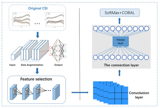 Based on Discrepancies in both fields, the DA method assumes that fine-tuning the deep network model with labeled or unlabeled target data can reduce the difference between the two domains. We used domain adaptation based on divergence to solve the problem of domain difference in the human motion recognition model based on CSI. The domain adaptation method using the correlation alignment principle is shown in Figure 5.