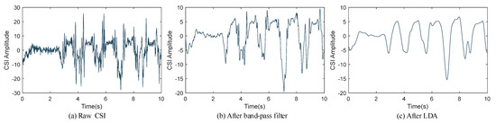 Due to the large CSI noise from the commercial wireless network card, the main reason is divided into two parts: internal and external factors. Internal factors are the internal state changes in Wi-Fi network card hardware, such as transmission rate adaptation, transmission power change, CSI reference level change, etc. External factors are static interference caused by environmental differences and dynamic effects caused by changes in indoor activities of different people. These internal state transitions cause high amplitude pulses and burst noise in CSI flow. Data calibration is to reduce noise as much as possible. Hampel filter, band-pass filter, and principal component analysis (PCA) were used to suppress useless signal components [21].