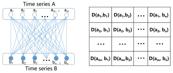 Normally, two or more sequences are computed to generate a new sequence, but the computation is always performed in pairs. Therefore, if we have two sequences, , m > n. Then, the Euclidean distance is used to calculate the distance between every two points of each sequence, D(ai, bj), where 1 ≤ i ≤ m, 1 ≤ j ≤ n, as shown in the matrix Figure 3 below.