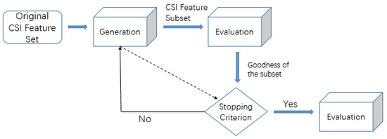 Figure 4 shows the general feature selection process. First, the original CSI feature set needs to generate a candidate subset. We used an evaluation function to compare the generated subset with the previously generated subset, leaving the better ones, and then used a stop standard to judge whether the feature selection process is stopped. Finally, we verified the effectiveness of the selected feature subset.