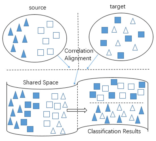 Our study used the divergence-based domain adaptation method called the CORAL loss to solve the problem of the distribution difference between the source and target domains. CORAL [20] aligns the source and target characteristics distribution in an unsupervised manner. It relies on linear transformation to minimize the square Frobenius norm distance of the covariance of source and target characteristics. CORAL must first calculate the second-order statistics (covariance) between the source and target data and then convert the source domain into the target domain to align their distribution. For the converted source domain data, we need to train additional classifiers, such as SVM, and finally classify the target domain data set.