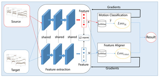 We input the feature vectors of the two domains into the feature aligner and then calculated to calculate the degree of difference between the two domains. Finally, we optimized our output results through gradient inversion and the parameters of the network so as to minimize both and , and then we shared the parameters obtained with the minimum loss in the training network and the test network so as to obtain a domain adaptive network model. Finally, the result was obtained by repeatedly updating the model, that is, the recognition result of the motion.