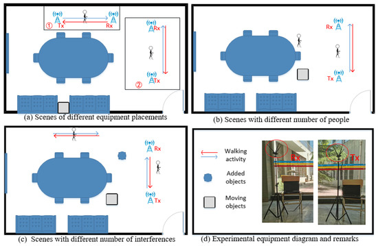 Figure 7 shows a variety of data acquisition scenarios in the conference room environment. Figure 7a shows ① and ② data acquisition scenes at different positions in the conference room, respectively. Figure 7b shows the scene where there are static people in the room except the experimental personnel and the position of indoor equipment changes. Figure 7c shows people walking indoors; the location of indoor equipment was changed, and indoor equipment was added. Figure 7d shows the explanation of the previous three plans.
