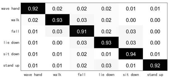 With the rapid update and iteration of information technology, the Internet of things has ushered in a new Artificial Intelligence and Internet of things (AIOT) era. As a critical technology of human-computer interaction in intelligent life, situational awareness has entered people’s daily life [1,2,3,4]. Through the collection and analysis of scene information, this technology enables computing devices to have an intelligent perception of the environment and personnel information in the perception space. According to the collection method of human action samples, action recognition mainly includes the following three categories: (1) vision-based [5]; (2) sensor-based [6]; (3) based on Wi-Fi [7,8]. In a vision-based system, human motion is captured by using the optical camera; in the sensor-based system, the limb motion characteristics are captured by sensors on the human body (such as sports bracelets). Through the collected human action information, different data processing processes, and classification learning, the above method can recognize the action information of personnel. However, these technologies have their limitations. The vision-based perception scheme has some defects, such as profound influence by light, poor privacy, blind spots, etc. At the same time, long-term detection also has high requirements for energy consumption. It is difficult to wear and deploy sensors for the sensor-based sensing scheme and is not generally simple.
