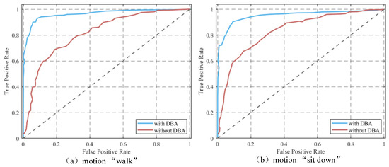 From the ROC curve and AUC area in Figure 10, we can see that no matter what kind of motion, when we use DBA technology, the recognition effect of the action data set model collected in this paper was significantly higher. It can be seen from Figure 10 that DBA technology has a certain contribution to improving the model recognition rate of Wi-CAL because we believe that the data enhancement technology was effective, and we will use the data enhancement technology to improve the model recognition rate in the subsequent experiments.