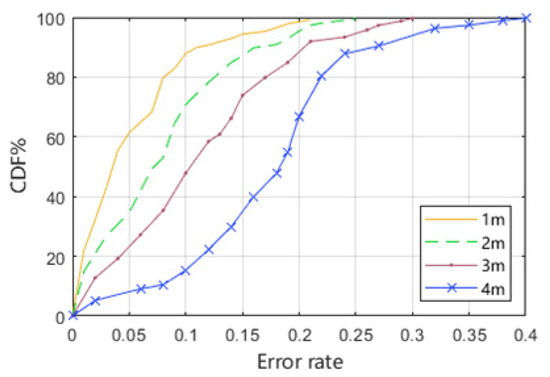 The distance between devices affects not only the sensing range but also the sensing recognition results. Four groups of spacing correlation experiments were set up in the open hall to explore the influence of spacing on recognition resolution. In the experiment, RX and TX were set at intervals of 1 m, 2 m, 3 m, and 4 m, respectively. Under each spacing, the experimenter kept the same position to perform the setting action. The cumulative distribution functions (CDF) of the error rate are shown in Figure 11.