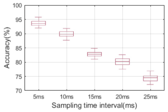 Figure 12 shows the recognition accuracy of Wi-CAL under different sampling rates. It can be seen that when the sampling time interval increases from 5 ms to 10 ms, the average recognition accuracy decreases from 94.71% to 90.13%. When the sampling time interval increases to 20 milliseconds, the average recognition accuracy decreases to 80.50%, and when it increases to 25 ms, the average recognition accuracy decreases to less than 75%. Therefore, we learned from it that when the sampling interval is no more than 20 ms, Wi-CAL obtains a better recognition accuracy. Our experiments show that samples with a high sampling rate have richer action information; therefore, higher accuracy can be obtained. However, in practical experiments, with the improvement of the sampling rate, the recognition system also encountered the problem of a high packet loss rate. Therefore, by using data sets collected at low sampling rates, Wi-CAL still has high recognition accuracy.