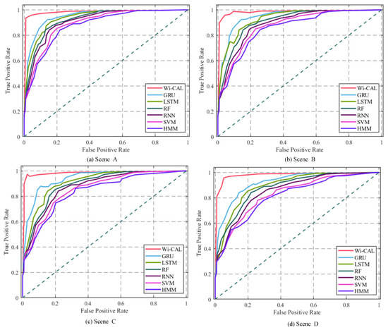 From the ROC curve in Figure 14, it can be clearly found that in scene A, the accuracy rates of the Wi-CAL, HMM, SVMm, and RF are 94.56%, 73.10%, 76.2%, and 85.3%, respectively, indicating that the improved neural network deep learning method can achieve better results than the traditional method in recognition and classification after feature extraction. Compared with the basic neural network structures GRU, LSTM, and RNN, the most prominent feature of Wi-CAL is cross-scene recognition, and the recognition rate does not change much with the scene change. At the same time, compared with the other three deep learning algorithms, Wi-CAL has better adaptability and robustness to human motion characteristics. It can be seen from the four figures that the recognition effect of Wi-CAL does not change much when the four scenes are switched, but the recognition rate of the other six algorithms changes greatly, which fully proves the effectiveness of this method in solving the problem that the model performance changes with the scene switching.