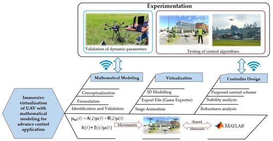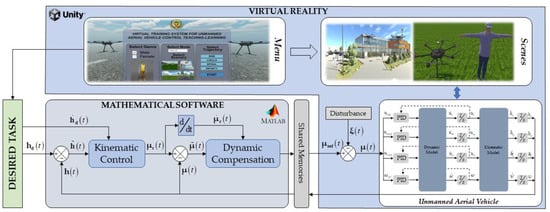The purpose of these games is that they serve to test and explore multiple solutions to problems posed in real situations, and discover the information and knowledge that would help to intervene without fear of making mistakes []. Therefore, this work presents an interactive and immersive virtual training system that allows the implementation and evaluation of advanced control algorithms for the autonomous and teleoperated navigation of a UAV. The virtual system is intended to serve as a learning tool in the engineering area, specifically in the robotics area. The virtual environment is developed in the Unity3D graphics engine (Unity Software Inc., San Francisco, CA, USA). In addition, the kinematic and dynamic modeling of the UAV is incorporated with the purpose of generating greater realism in the flight animation. The mathematical models are obtained through the heuristic method and experimentally validated with the DJI Matrice 600 Pro hexacopter (DJI, Nashan District, Shenzen, China). The control scheme implements a cascade controller, which consists of a kinematic controller and another one with dynamic compensation, for which the mathematical model requires as input control signals the maneuvering velocities of the UAV. For the implementation of the advanced control algorithms the mathematical software MatLab (the MathWorks Inc., Natick, MA, USA) is considered. Therefore, a real time communication between Unity and MatLab software is considered through shared memories developed by the authors. Finally, the results obtained through the 3D virtual simulator and validated by experimental tests are presented. In addition, the usability results are presented in order to evaluate the acceptance of the developed virtual system.