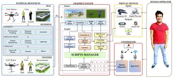 For the development of the virtual environment, the diagram in Figure 2, is made up of the following phases: (i) External Resources, includes all the elements immersed in the virtual environment, these elements can be organized mainly into three groups: (a) virtualized scenario, referred to urban, rural, and educational environments, as close to reality as possible in order to achieve learning in the environment itself for the implementation of the different advanced control algorithms for UAV trajectory tracking; (b) Virtualized UAV, the DJI Matrice 600 Pro hexacopter is digitized based on its physical characteristics and real dimensions; (c) Avatar represents the user who will use the simulator, for the digitization the anthropomorphic aspect of a human, male and female, is taken into account. The role that the avatar can play can be changed and this affects the clothing of the digital model. To perform the digitization process of these resources, CAD tools are used to model the elements, then using software such as 3DS Max and SketchUp, among others. In addition, layers are added to the elements to increase their realism, finally, the files are exported in .fbx compatible with Unity software; (ii) Graphics Engine, Unity is defined as a graphics development platform, available for Microsoft Windows, Mac OS, and Linux []. The development process of the virtual environment in Unity is organized in two groups: