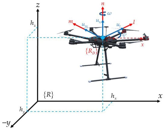 where with represents the vector of velocities of the hexacopter with respect to the reference frame ; with is a non-singular matrix representing the behavior of the UAV in motion, and represents the vector of maneuverability velocities of the UAV.