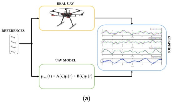 This process consists of the following stages: (i) Excitation of the Hexacopter, the objective of this stage is to know the value of the output velocities before a predetermined excitation value, the difference between these signals indicates the dynamics of the hexacopter; (ii) Identification Algorithm, in this stage the dynamic parameters of the model are identified based on the data taken in the previous phase, as shown in Figure 4a. For which an algorithm based on optimization was implemented, which reduces the error resulting from comparing the values of the hexacopter with the values obtained from the mathematical model. Finally, when the error is considered negligible, the estimated dynamic parameters approximate the values of the hexacopter. Figure 4b shows the behavioral signals of the real UAV velocities with respect to the excitation or reference signals injected into the UAV.